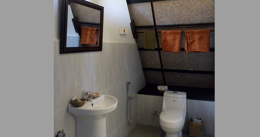 This cottage is situated highest on the slope with a double bed and an extra bed. A spacious balcony overlooks the lush greenery, and an outdoor staircase takes you down to the toilet below for a unique bathroom experience.